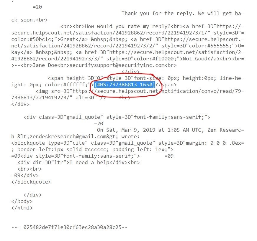 收到回复邮件后,我决定检查一下该系统是否也采用与Zendesk类似的模式。查看邮件源代码后,我很快就发现其中包含一个特殊的哈希:
