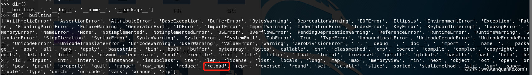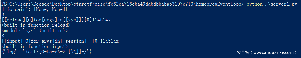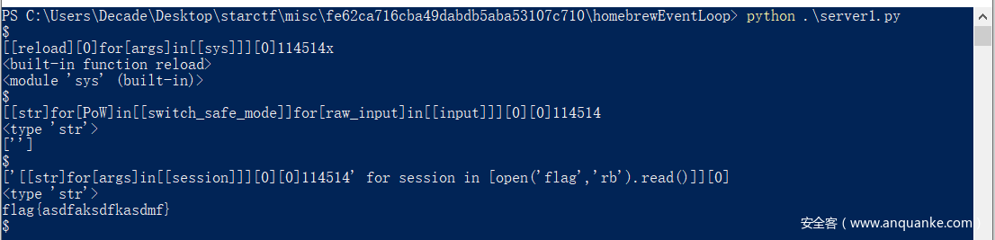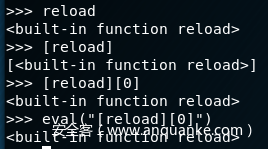 可以看到这里eval之后得到是aaa函数,这里并没有重载,[[reload][0]for[args]in[[sys]]][0] 这一整句的目的既为了得到reload函数,又为了覆盖掉args,然后通过 print handler(args) 达到重载的目的。回到最先的问题,这里用[reload][0],是为了绕过空格,很容易想到mysql注入的时候通过(xx)来绕过空格的情景,于是通过 [[input][0]for[args]in[[session]]][0]114514x拿到flag
