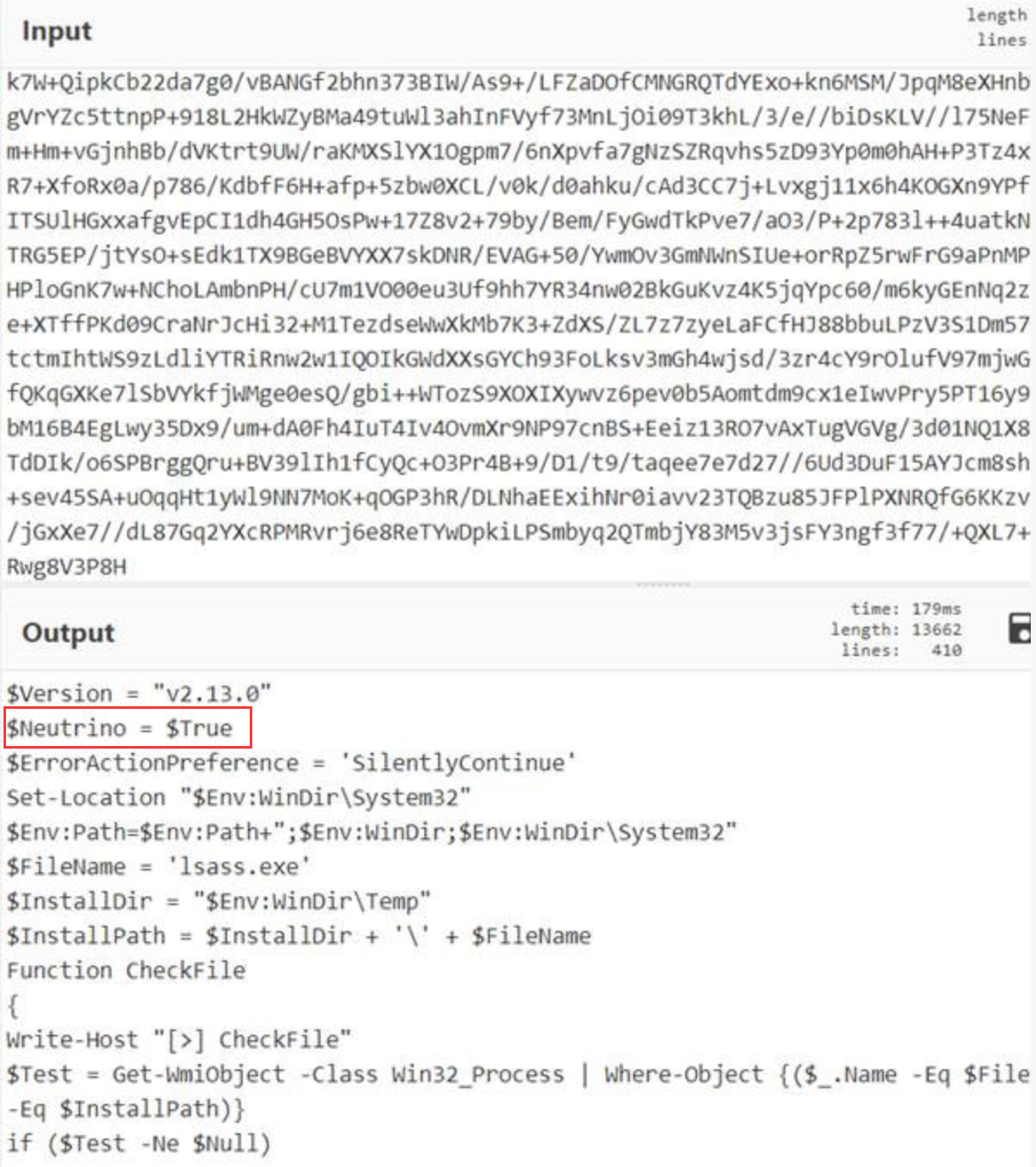 Neutrino(中微子)是几乎没有质量的亚原子粒子,具有奇异的特性,它很少与周围环境发生相互作用。虽然这段Payload自称为Neutrino(这里不要与之前已经消失的Neutrino漏洞利用工具包搞混,二者并无关联),但却与其原子特性大相径庭,它会与受感染的系统进行大量交互。