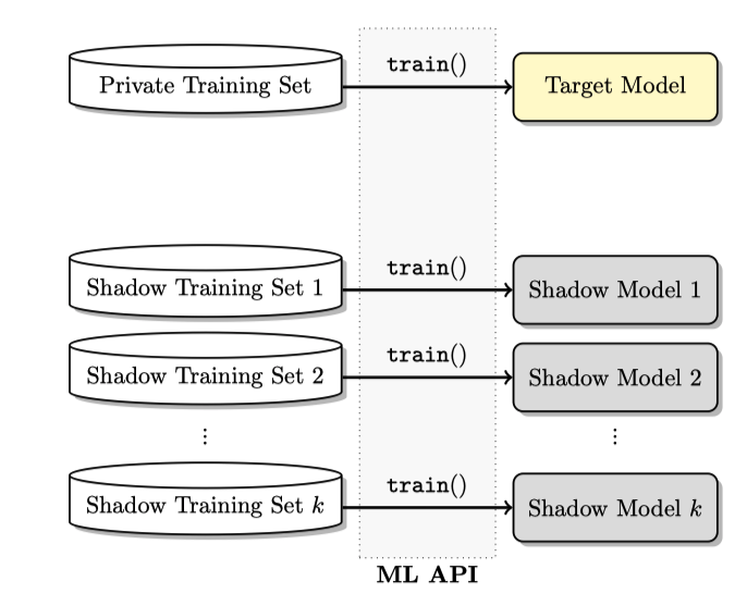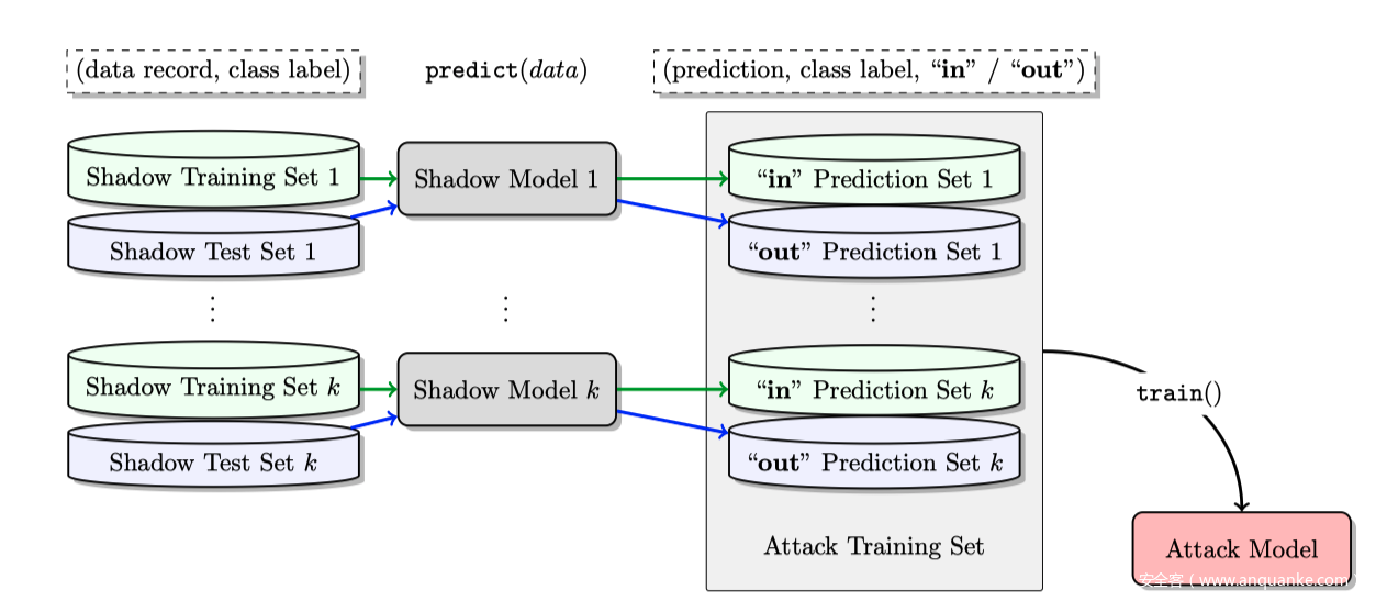 由于Attack Model需要训练集才能生成,因此作者进一步提出了影子模型(shadow model)这个概念。