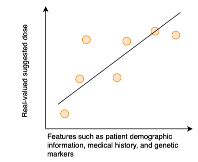 如上所示,假如我们有一个基于病人的人口统计信息、医疗记录和基因特征来预测病人应该服用多少剂量药物的线性回归模型。我们假定基因特征是敏感特征x1, 那么模型逆向攻击的目的就是通过构造大量的样本,来推断病人的基因特征x1的值是多少。