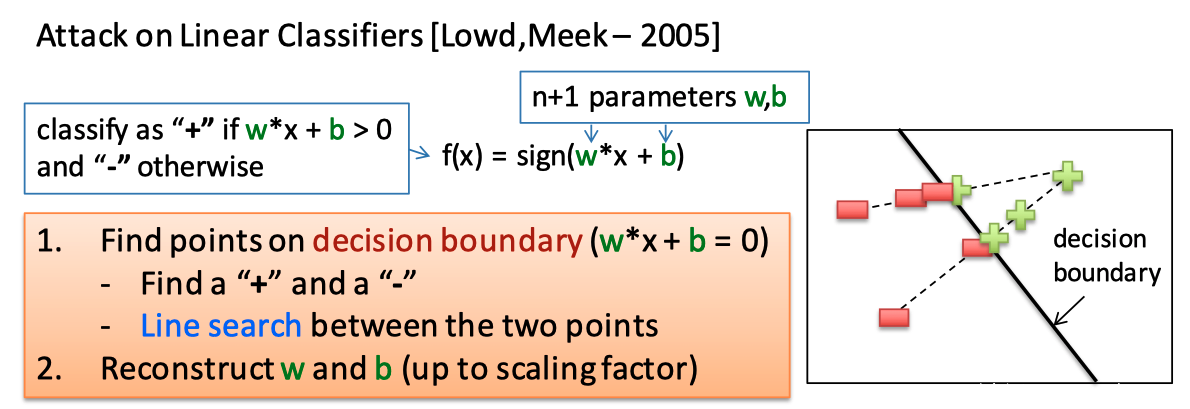 函数的参数是 w 和 b,其中w是n维的权重向量,b 是偏置向量。我们对 sigmod 函数进行求反,得到一个线性函数 $w*x + b$,因为$w$ 是n维的权重向量,b是1维的偏置向量,因此总共有n+1个参数需要求解,也就是说,至少需要n+1个等式就可以借出这个方程,所以从理论上而言,我们只需要查询 n+1 次便可窃取到这个逻辑回归模型。