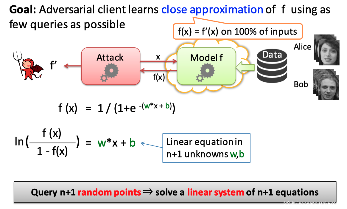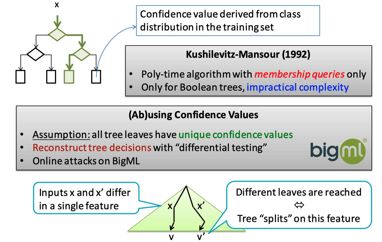 这种攻击方法由Tramèr等人在2016年提出,并发表于信息安全顶级会议Usenix上,并分别展示了针对函数映射类模型(LR、SVM、神经网络)、决策树模型和不输出置信度的模型的提取方式。
