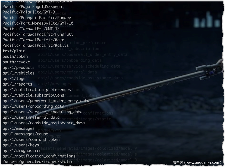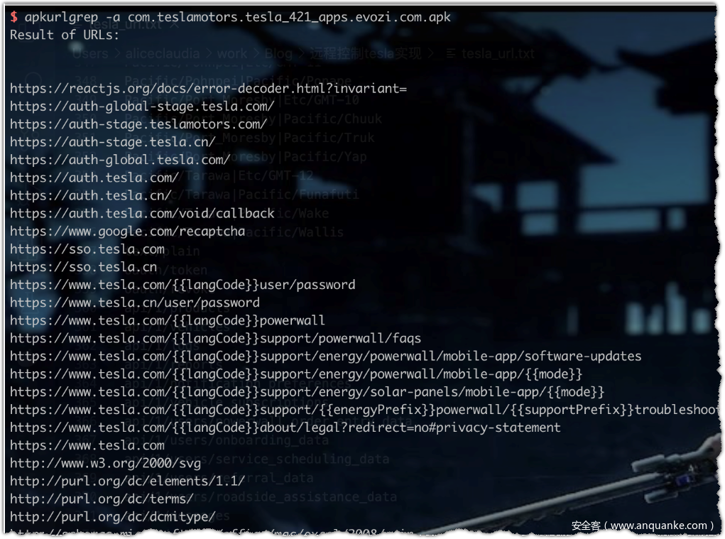 安装完成后,执行apkurlgrep -a com.teslamotors.tesla.apk 等待显示结果即可。也可以将结果重定向到文件中。结果里有一些是多余的,找到一些我们关注的点即可。这里关注到有api的地址owner-api.teslamotors.com的地址,和带有api关键字的路径内容。