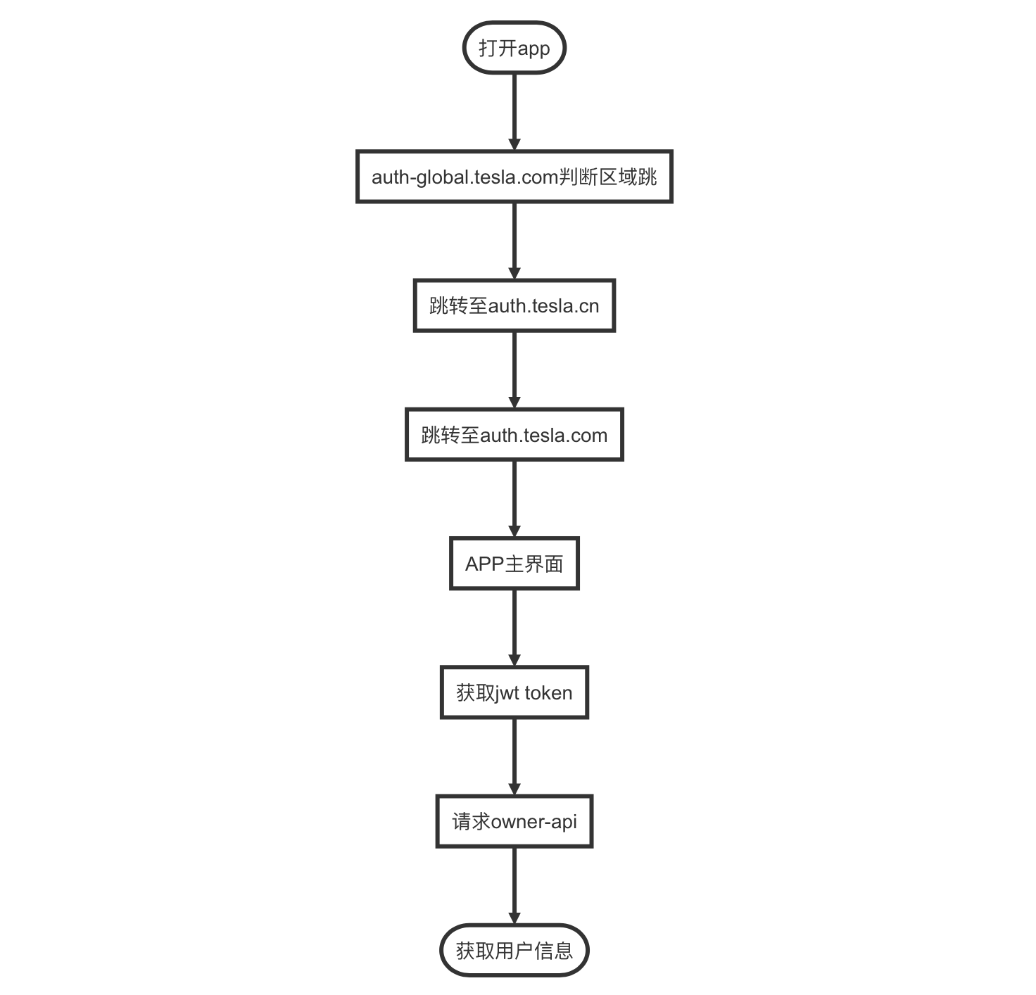其大致过程为先请求auth-global.tesla.com获取其地区,然后跳转到所属区域的服务,这里跳转到auth.tesla.cn,先显示的输入用户名,下一步后,跳转到auth.tesla.com域,显示用户名密码信息,输入用户名密码后也是经过auth.tesla.com。用户名密码正确,APP进行到程序主界面。 这里有两步,第一个先请求auth.tesla.com域获取jwt的token,第二将获取的jwt token带入请求owner-api.teslamotors.com。接下来的获取数据均请求到owner-api.teslamotors.com,由此也可以看出这个地址为api服务的地址,也就是最终我们只需要获取最后的那个token,就可以实现获取其他信息的操作。