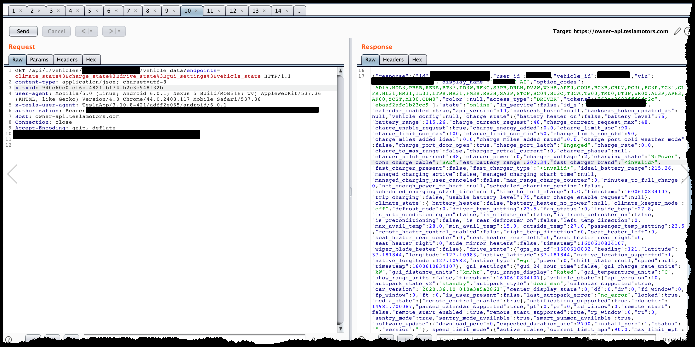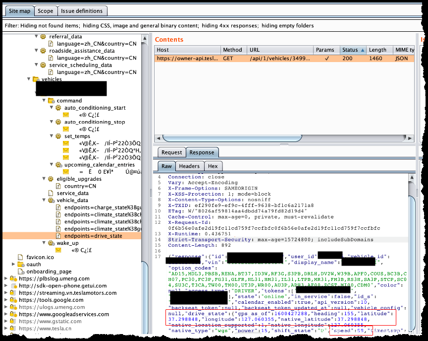 通过记录可以看到获取车辆详细信息的api地址为/api/1/vehicles/{vehicle_id}/vehicle_data ,通过抓取停止状态和行驶状态下的数据,可以看到由endpoints参数控制,值分别为drive_state(行驶中)、climate_state%3Bgui_settings、climate_state%3Bcharge_state%3Bdrive_state%3Bgui_settings%3Bvehicle_state。