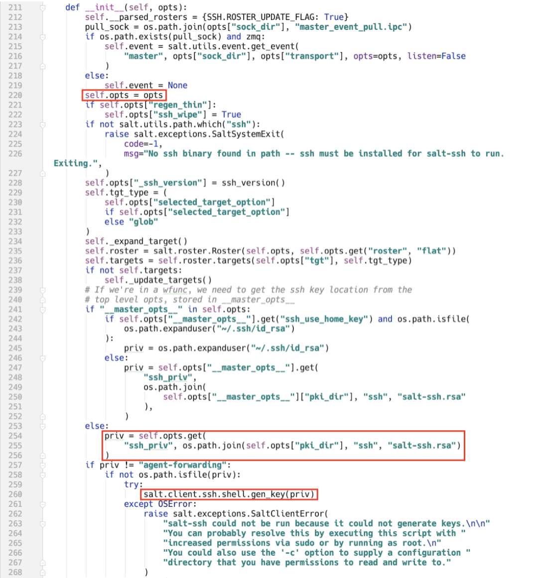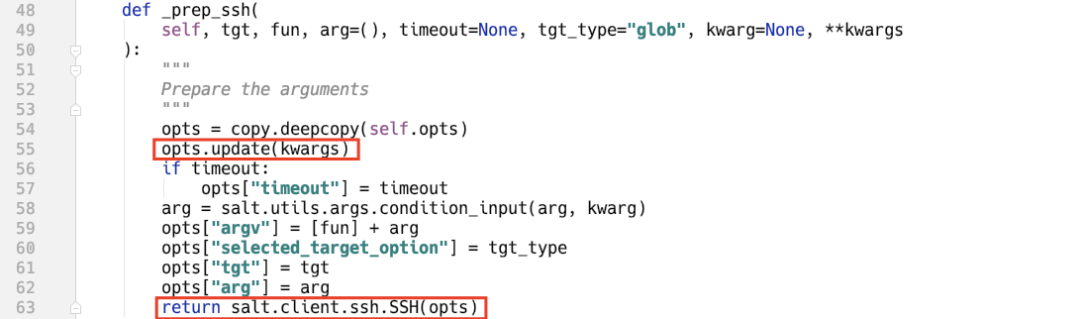 该方法将kwargs外部可控参数更新值opts变量,该变量可以理解为SaltStack系统的环境变量,使用该变量初始化salt.client.ssh.SSH。