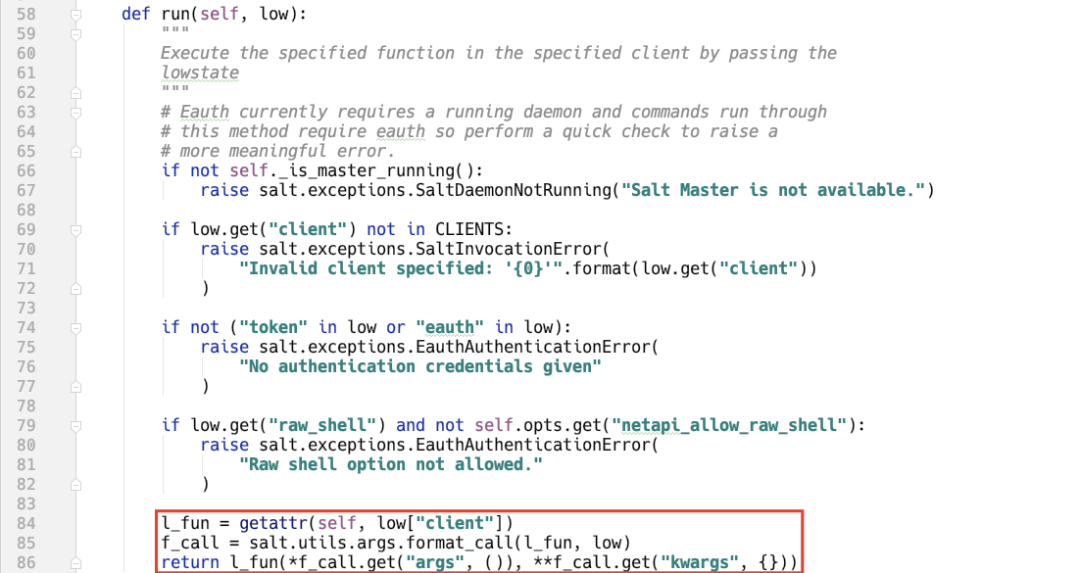 salt-api REST接口默认使用cherrypy框架,从run接口的实现上可以看出通过client参数动态调用NetapiClient类中的方法。