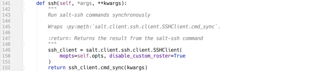 salt/netapi/init.py:NetapiClient.ssh()⇒salt/client/ssh/client.py:SSHClient.cmd_sync()⇒salt/client/ssh/client.py:SSHClient._prep_ssh()