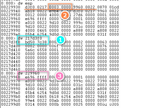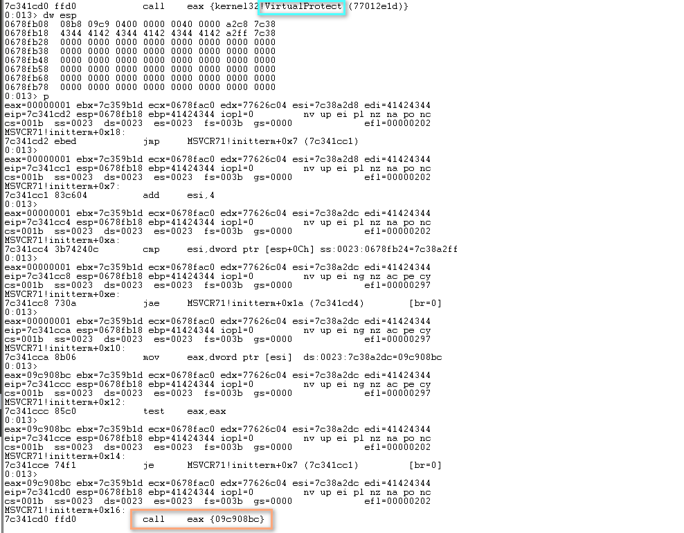 可以看到[[Parameter 1]+0xC]为之前写入值。第二次写入覆盖MSVCR71.DLL虚函数表中函数调用地址: