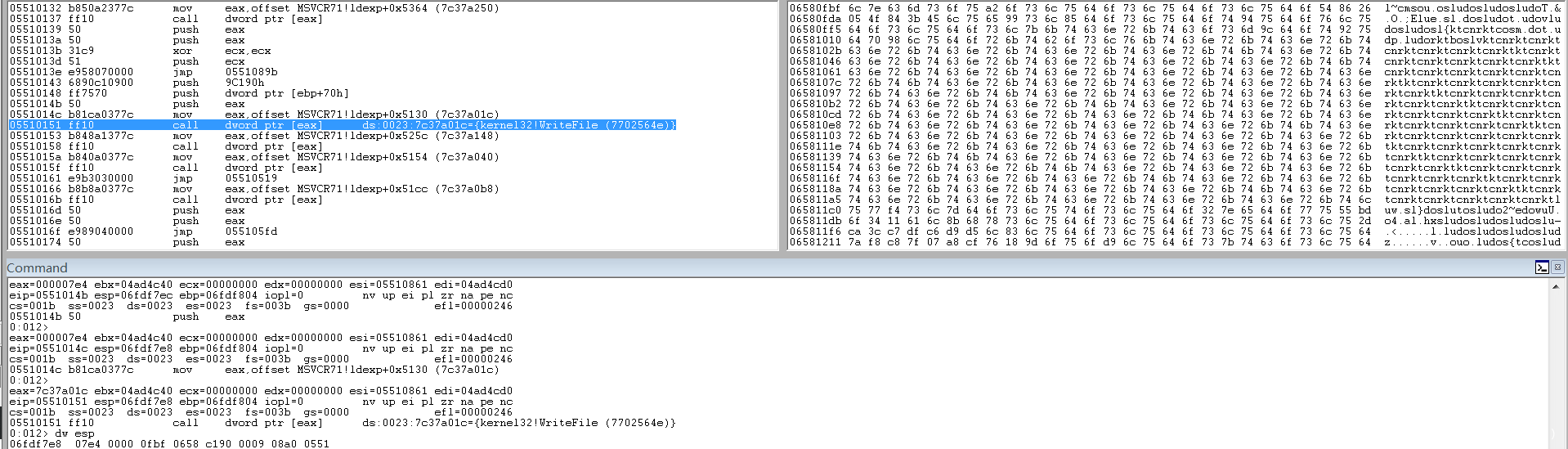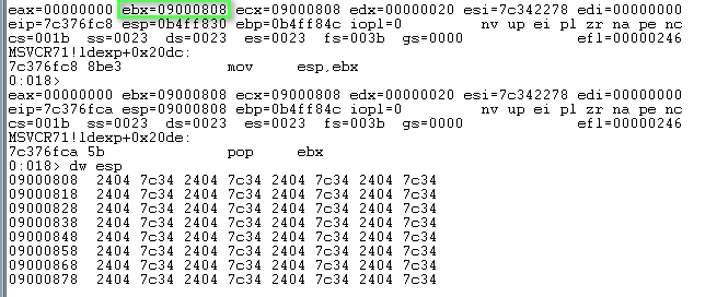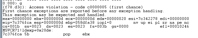 由上图可知第二次内存写入——覆盖MSVCR71.DLL虚函数表中函数调用地址,第四次内存写入——覆盖传递参数。