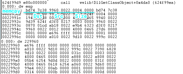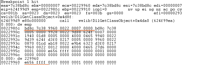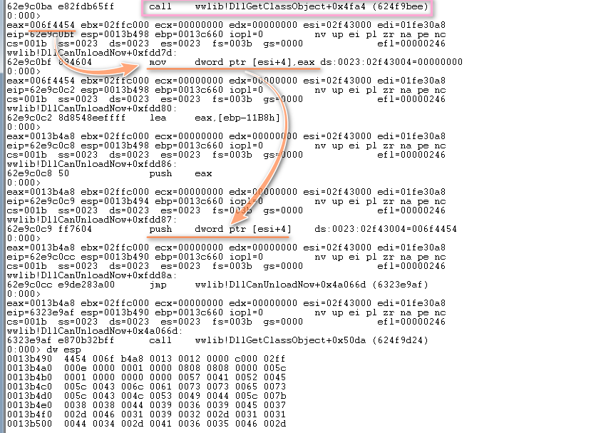待执行call wwlib!DllGetClassObject+0x50fe前查看栈中参数如下: