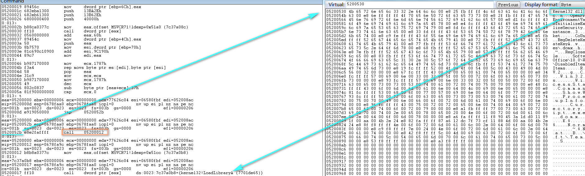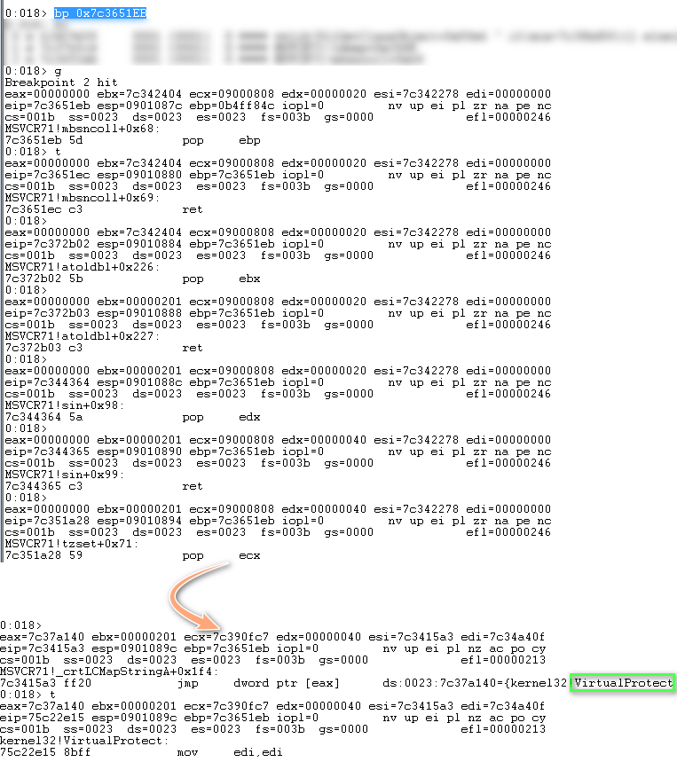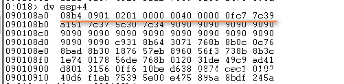 载入RTF文档,bp 0x7c376fc8设断,执行ROP链后调用VirtualProtect更改内存属性,跳转到Shellcode: