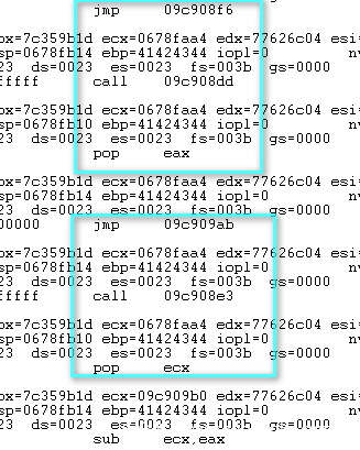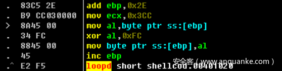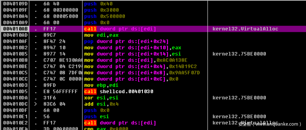 通过jmp+call+pop给传参,解密后续Shellcode: