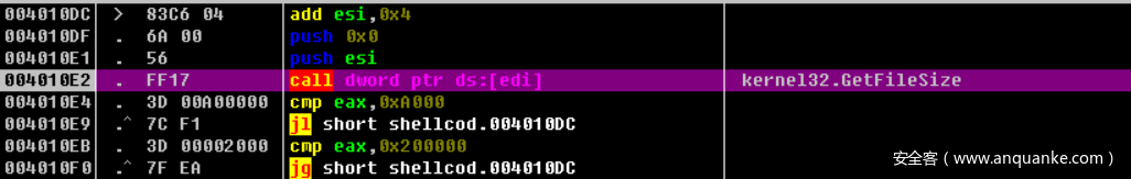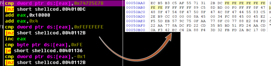 通过文件头与FEFEFEFE FEFEFEFE FFFFFFFF判断是否为样本文件及Shellcode起始位置: