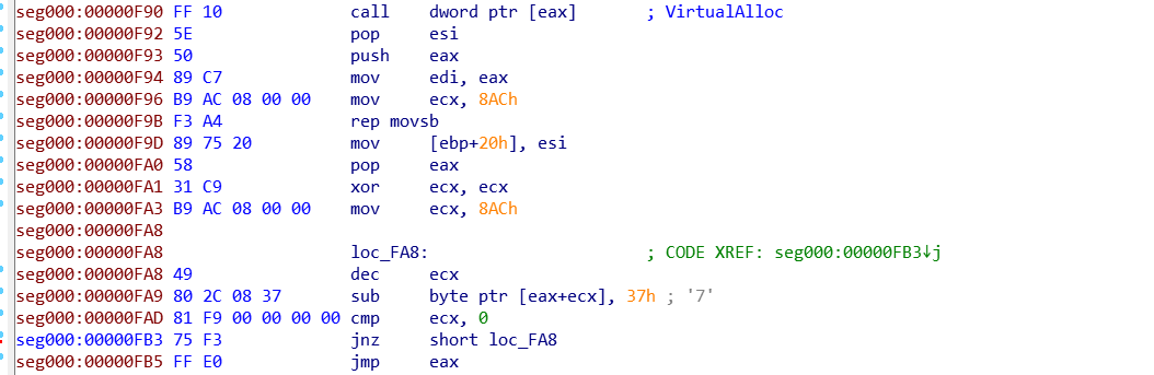 复制Shellcode到VirtualAlloc开辟空间内,之后跳转到第二部分Shellcode执行。