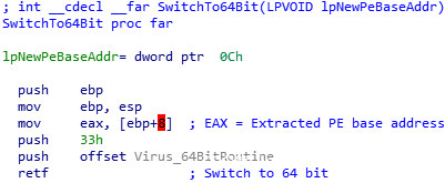32位的stage 2恶意软件会使用自定义的加载机制(该PE文件使用了拼凑形式的IAT以及重定位表),只导出了一个函数。对于64位的stage 2恶意软件,开发者使用了非常知名的天堂之门(Heaven’s Gate)技术来移交代码执行权。下文中为了简单起见,我们只分析了64位的攻击载荷。