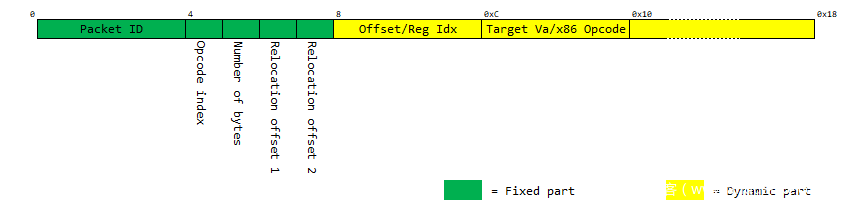 每条虚拟指令都存储在一个特定的数据结构中,该数据结构包含VM需要正确读取以及执行的所有信息。这个数据结构大小为24字节,由某些固定字段以及一个可变部分所组成(可变部分取决于具体的操作码)。在解释操作码之前,VM会解密操作码的内容(通过简单的XOR算法),然后使用重定位字段进行重定位(如果需要的话)。