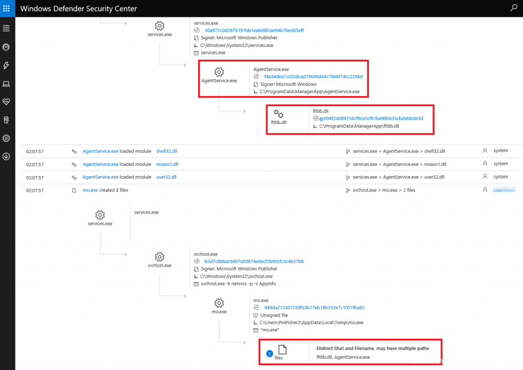 图10. Windows Defender ATP时间线可以准确描绘出服务形式的DLL旁路加载技术(本例中使用的是fltlib.dll)