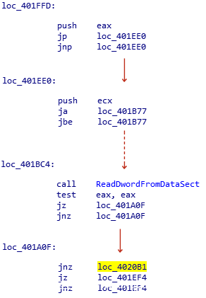 分析FinFisher时,我们碰到的一个代码混淆问题就是要移除恶意软件中的垃圾代码以及“意大利面条式代码”(一种用来迷惑反汇编程序的技术)。意大利面条式代码添加了连续的代码跳转,使恶意软件的程序流很难阅读,这也是这种代码名字的来源。FinFisher中的意大利面条式代码样例如下所示: