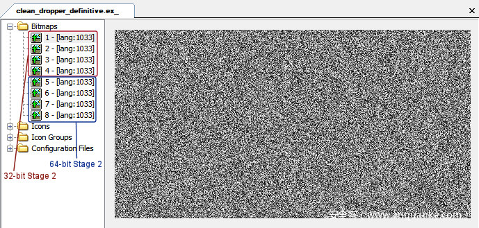 最后,如果通过了所有这些验证,加载器会根据受害者操作系统的具体情况(32位或者64位),解密可执行文件中内嵌的一组位图资源(stage 2),准备执行一个新的VM解码层。
