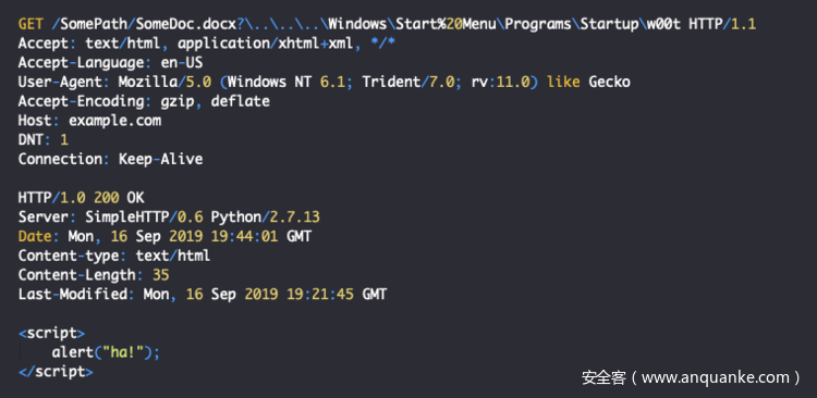 现在我们已经搞定目录遍历,就可以将文件拷贝到错误的位置。这里比较直观的一个目标就是C:\Users\<username>\AppData\Roaming\Microsoft\Windows\Start Menu\Programs\Startup目录,当用户登录系统时,就会自动运行保存在该目录中的所有项目。为了访问到该路径,我们只需要多越过两级目录,就能接触到C:\Users\<username>\AppData\Roaming\Microsoft,然后正常拼接出我们所需的完整路径即可: