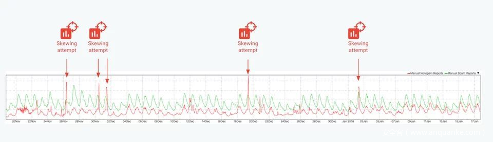 如图所示,2017 年 11 月底至 2018 年初,Gmail遭遇了至少 4 次大规模恶意攻击试图让分类器偏斜。