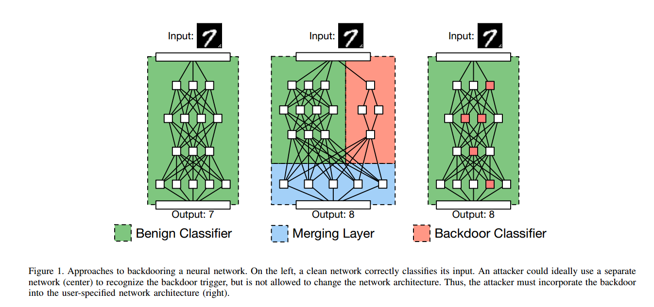 如上图所示,图左是一个正常的模型,图中是黑客期望的模型的样子(导致结果识别为8,而非7)。但黑客没有办法修改模型,所以他必须将后门合并进用户指定的网络架构里(右)