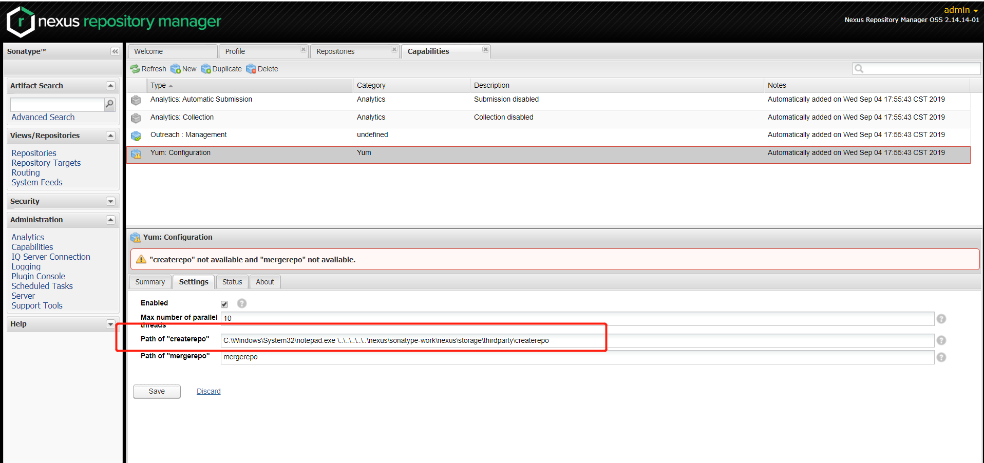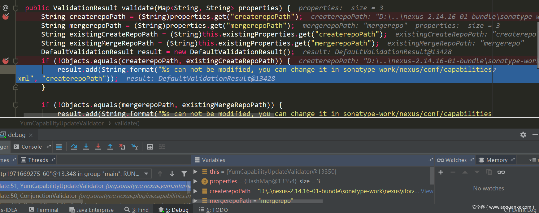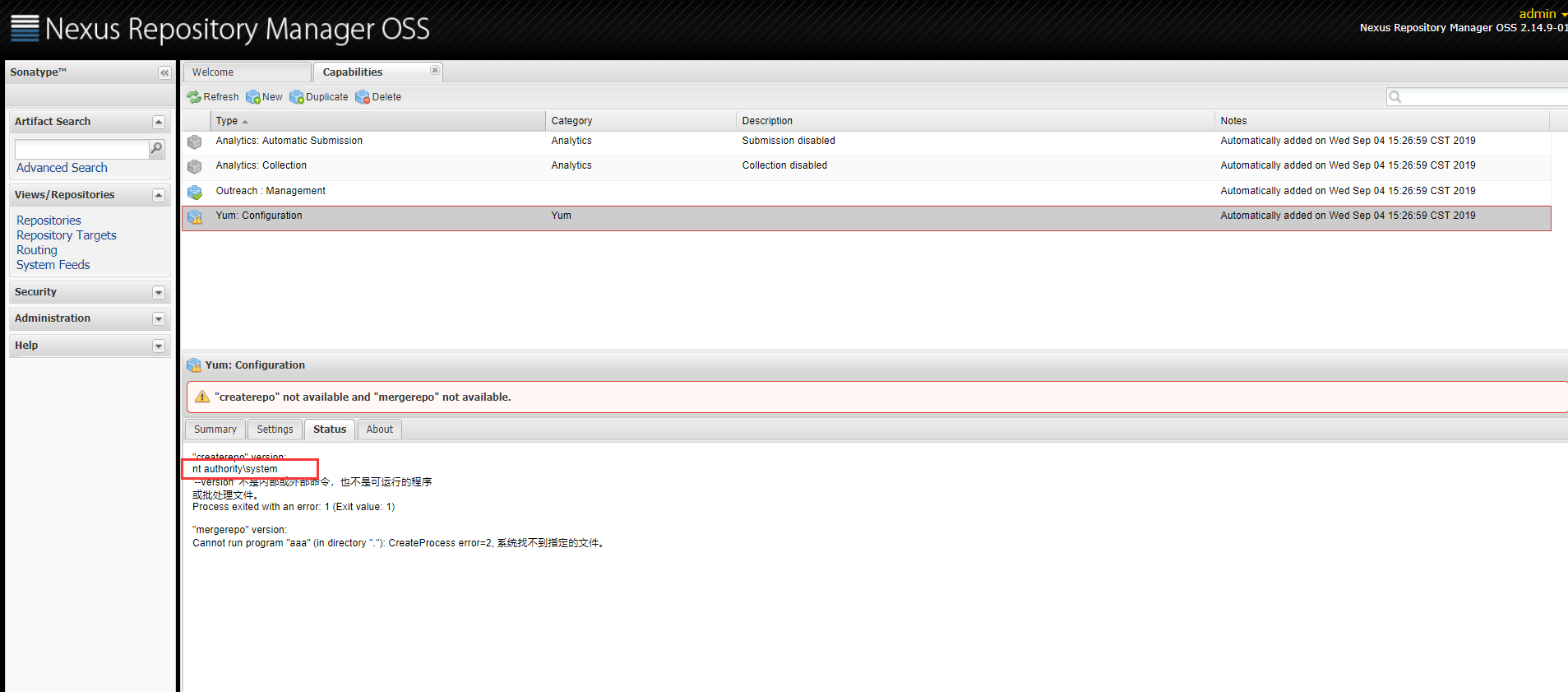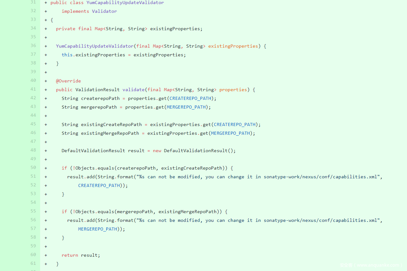 删除了之前的修复方式,增加了YumCapabilityUpdateValidator类,在validate中将获取的值与properties中设置的值使用equals进行绝对相等验证。这个值要修改只能通过sonatype-work/nexus/conf/capabilities.xml: