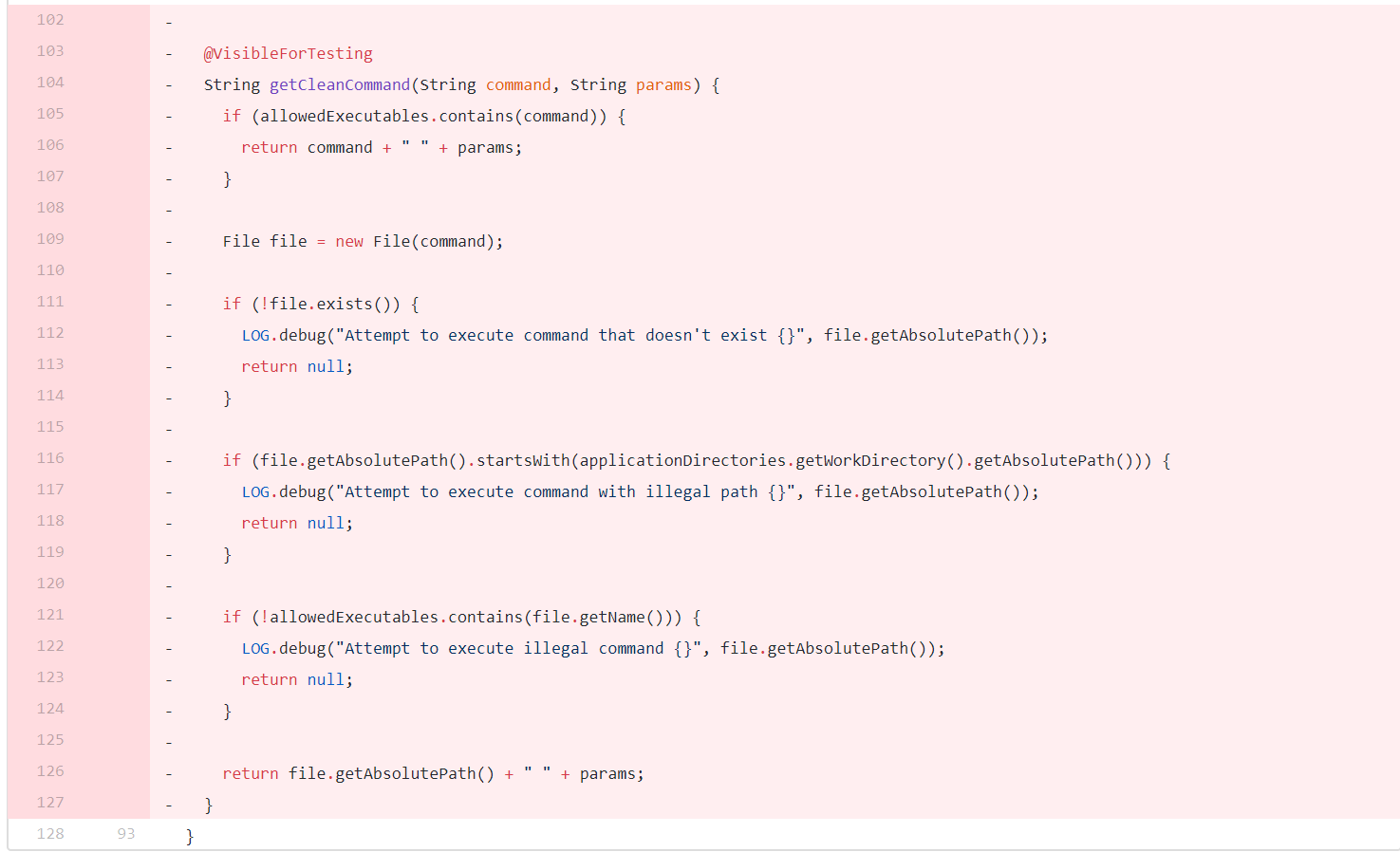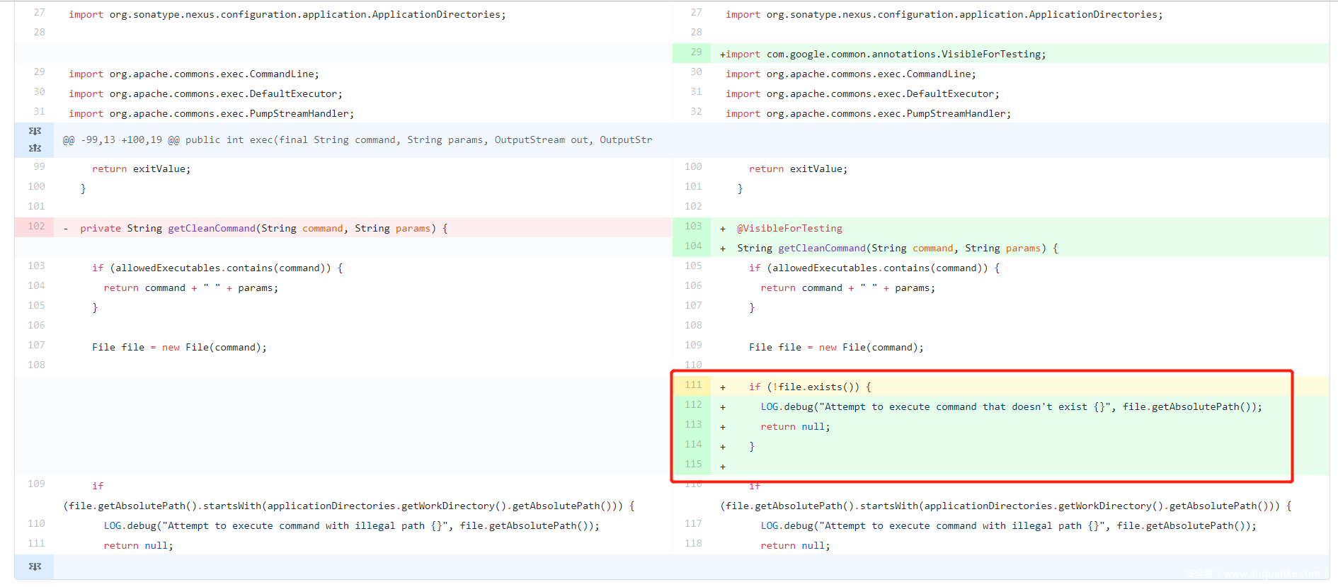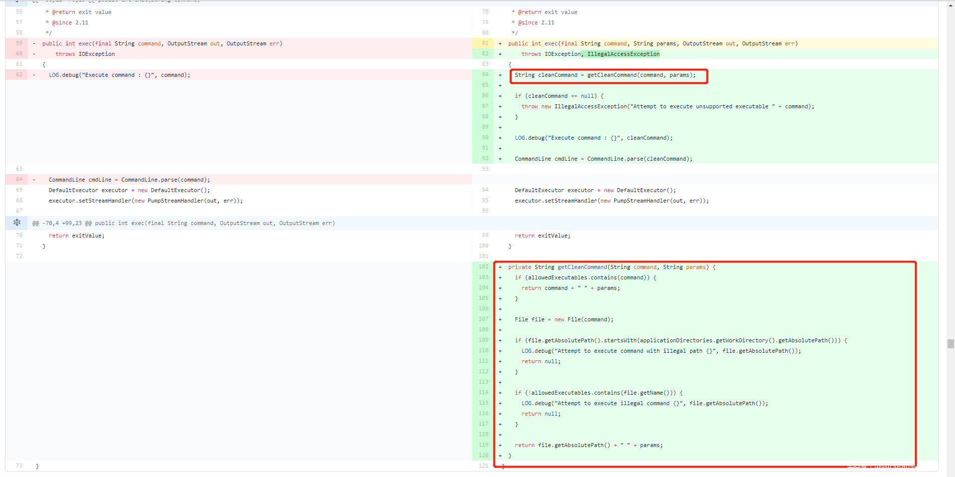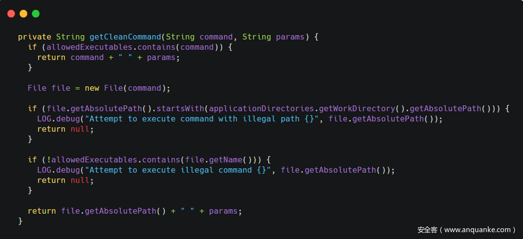 看到补丁中的getCleanCommand()方法,new File(command)是关键,new File()是通过将给定的路径名字符串转换为抽象路径名来创建新的File实例。 值得注意的是,这里面路径字符串是可以使用空格的,也就是
