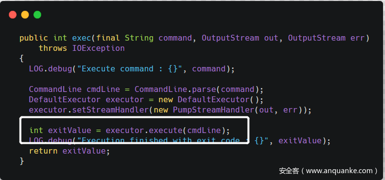 在执行命令前先对命令解析,CommandLine.parse(),会以空格作为分隔,获取可执行文件及参数。