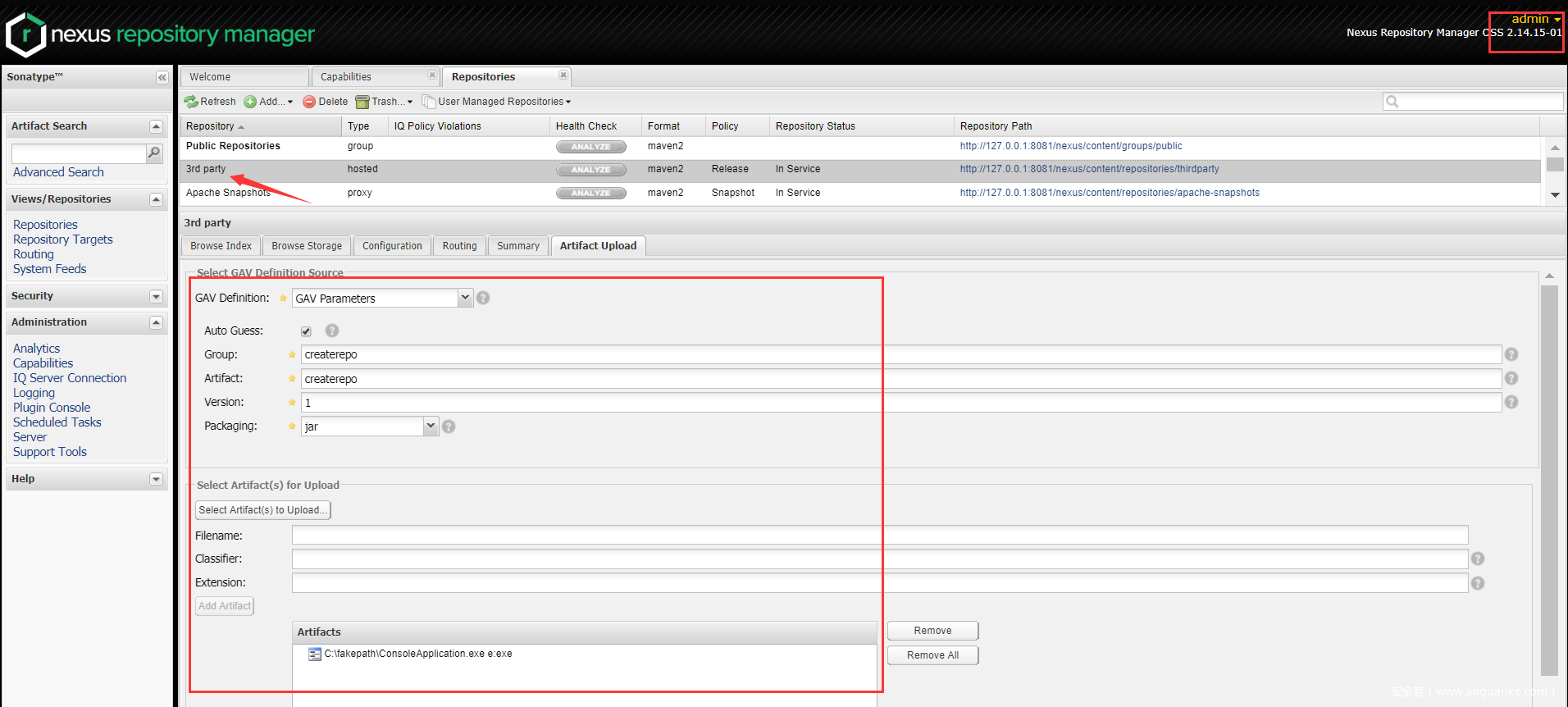导航到Views/Repositories->Repositories->3rd party->Artifact Upload,我们可以上传恶意的exe文件: