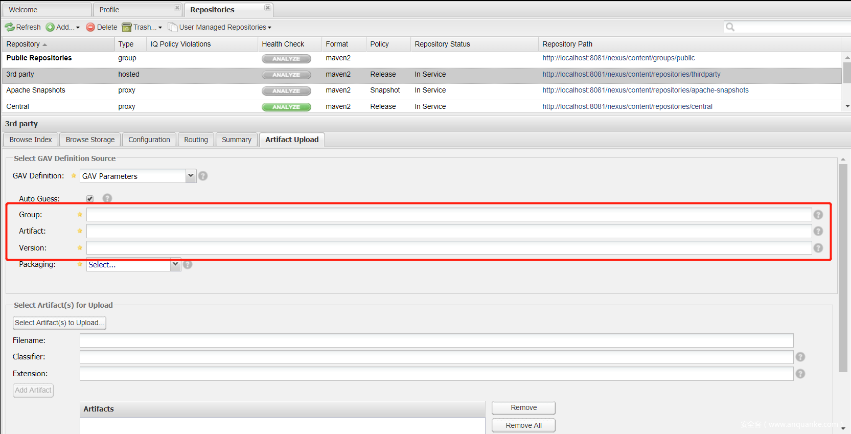 一开始看到file.exists()就走进了思维定势,以为是判断文件存在的,但是看了官方的文档,发现是判断文件或者目录存在的。。这点也就是这个漏洞形成的第二个关键点,我不能创建文件,但是可以创建文件夹啊。在Artifacts Upload上传Artifacts 的时候,可以通过GAV Parameters来定义。