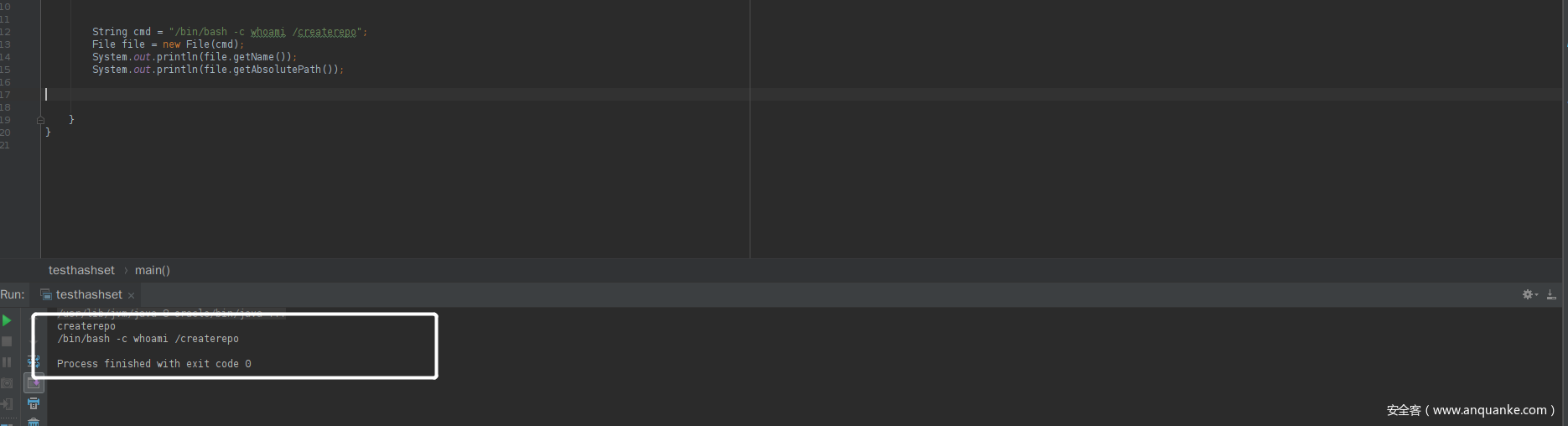 在getCleanCommand()方法中增加了一个file.exists()判断文件是否存在。之前的/bin/bash -c whoami /createrepo这种形式的肯定就不行了,因为这个文件并不存在。所以现在又多了一个判断,难度又加大了。难道就没有办法绕过了?不是的,还是可以绕过的。
