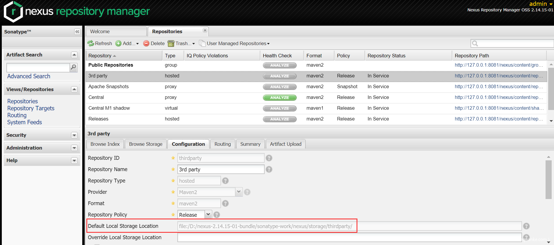 导航到Views/Repositories->Repositories->3rd party->Configuration,我们可以看到默认本地存储位置的绝对路径(之后上传的内容也在这个目录下):