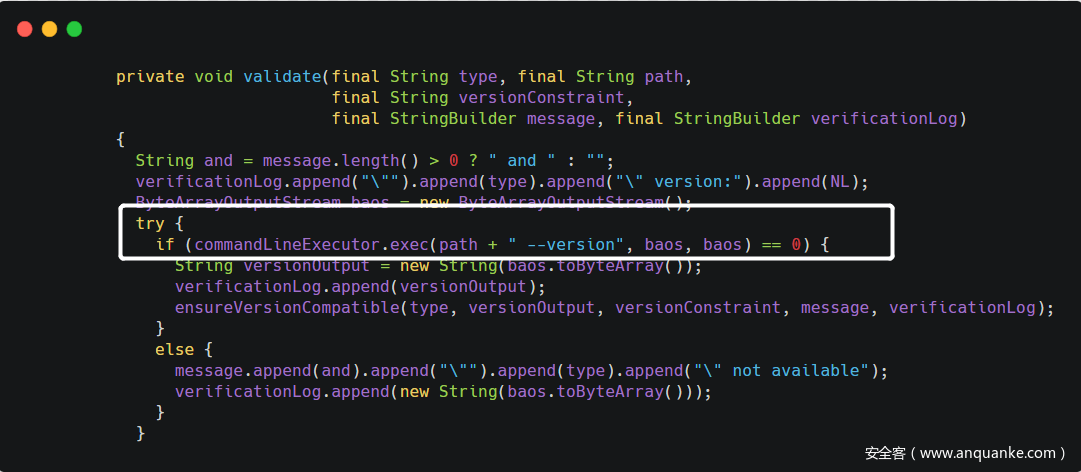 传进来的path是用户可控的,之后将path拼接--version之后传递给commandLineExecutor.exec()方法,看起来像是执行命令的方法,而事实也是如此。跟进CommandLineExecutor类的exec方法
