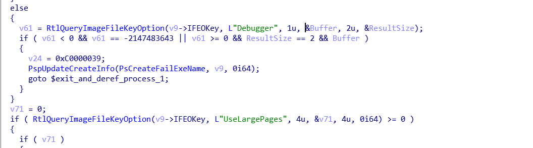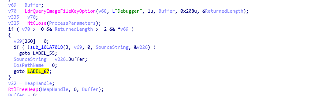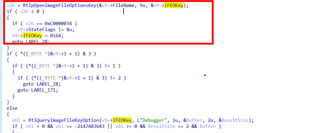 在这段代码里判断IFEOKEY 是否有对应Debugger注册表设置,往上面翻会发现IFEOKey打开的就是当前进程名的IFEOKey的注册表