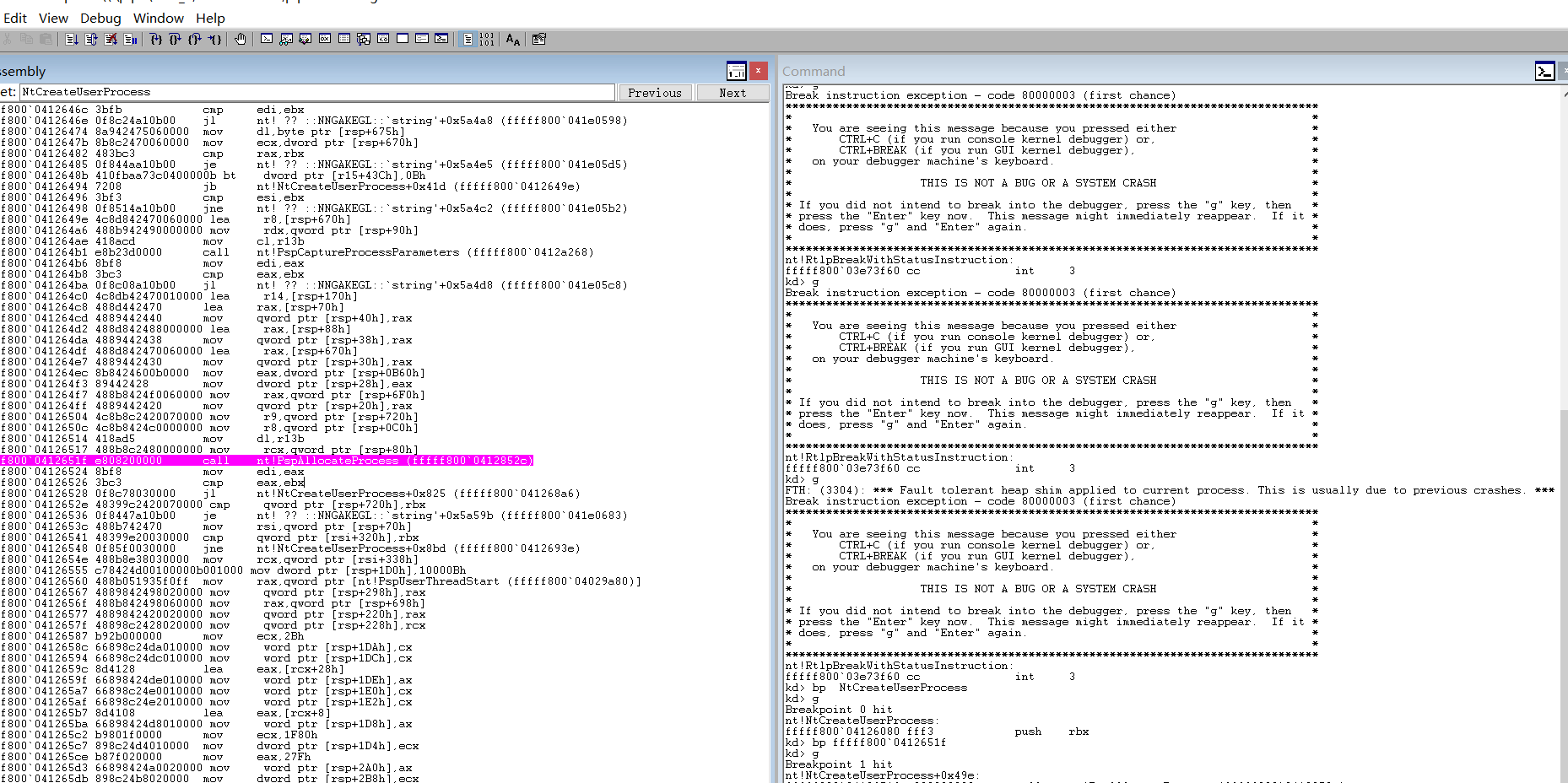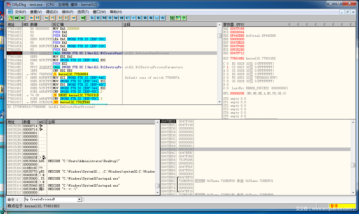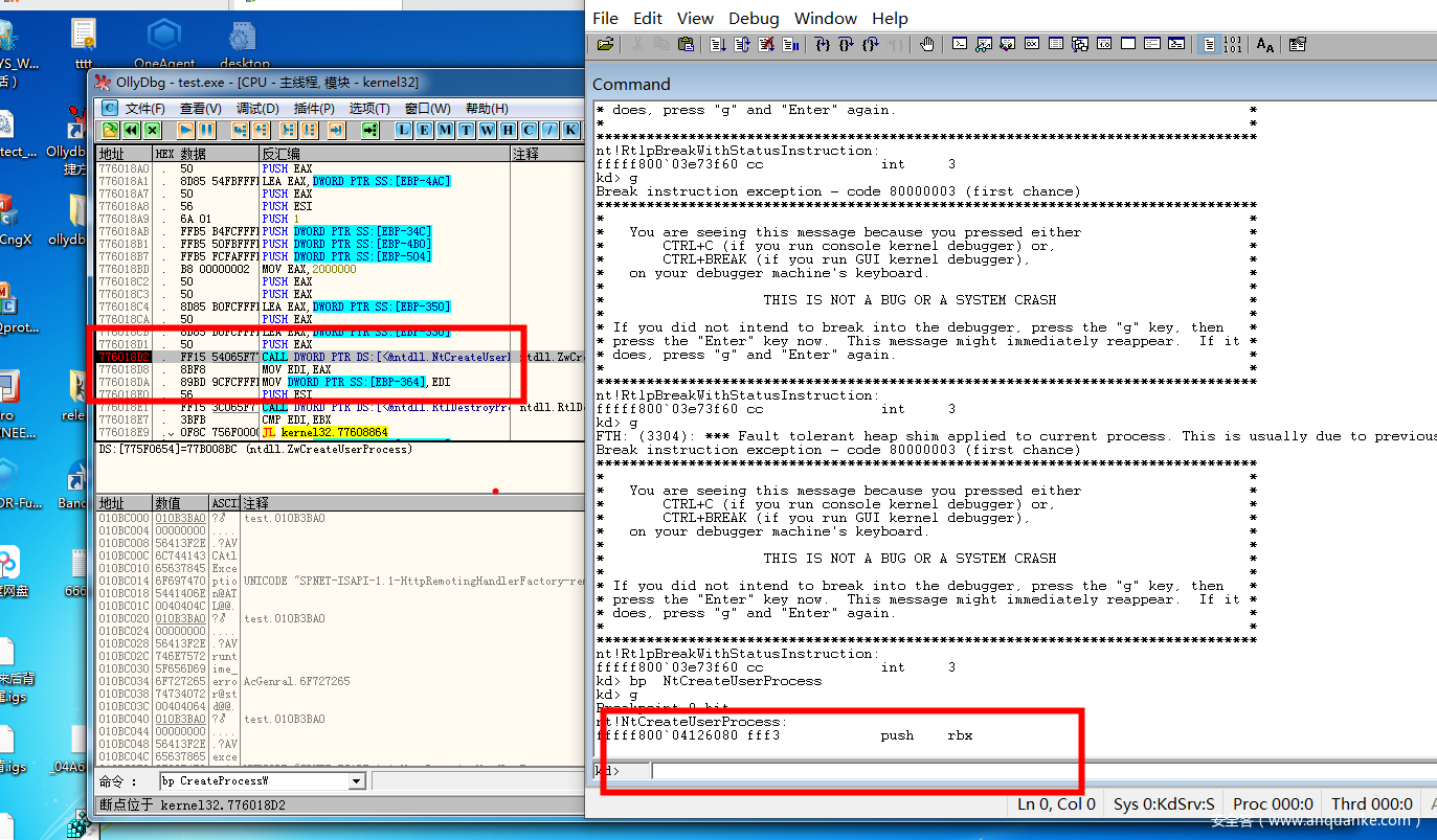 接下来在NtCreateUserProcess上下断点,当Ollydbg里执行NtCreadtUserProcess时windbg里断点停下来