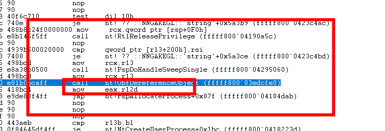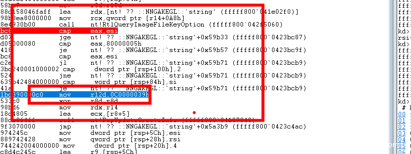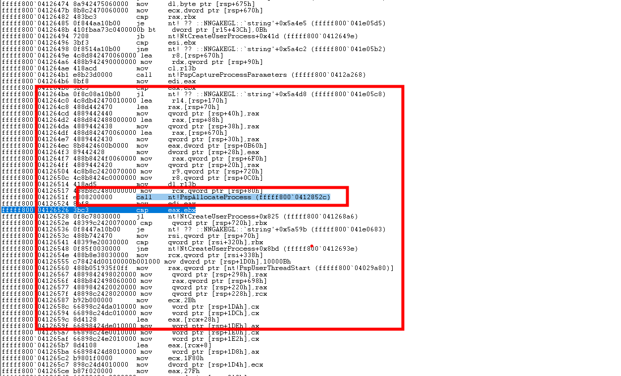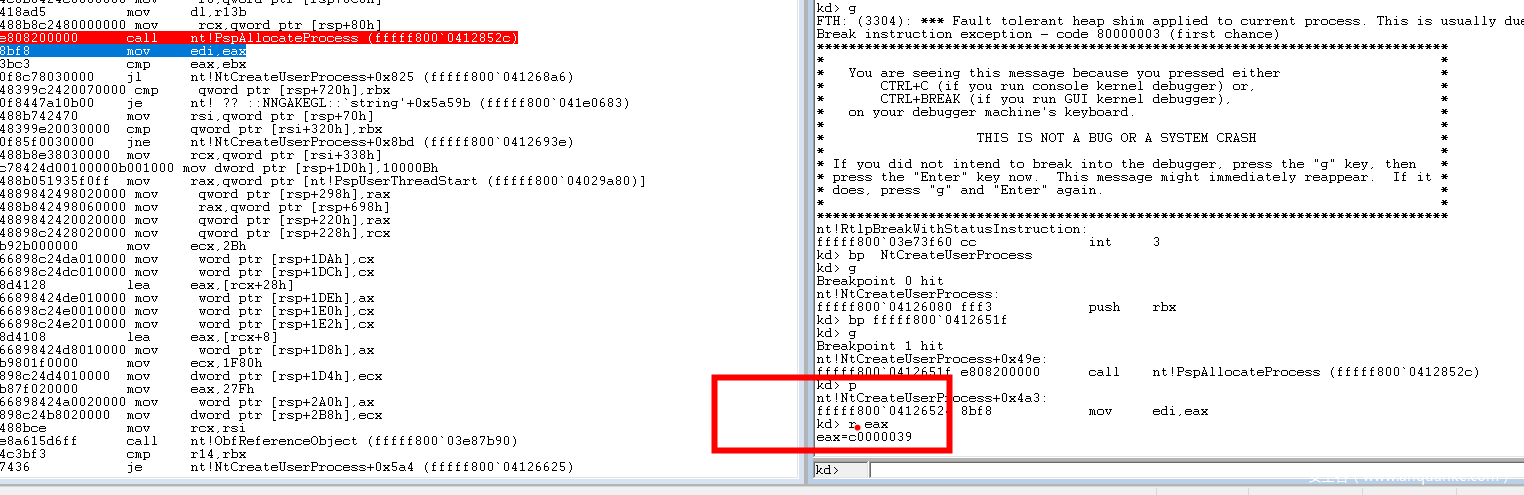 调试器停在了call nt!PspAllocateProcess (fffff8000412852c),F10 后查看eax值r eax,显示