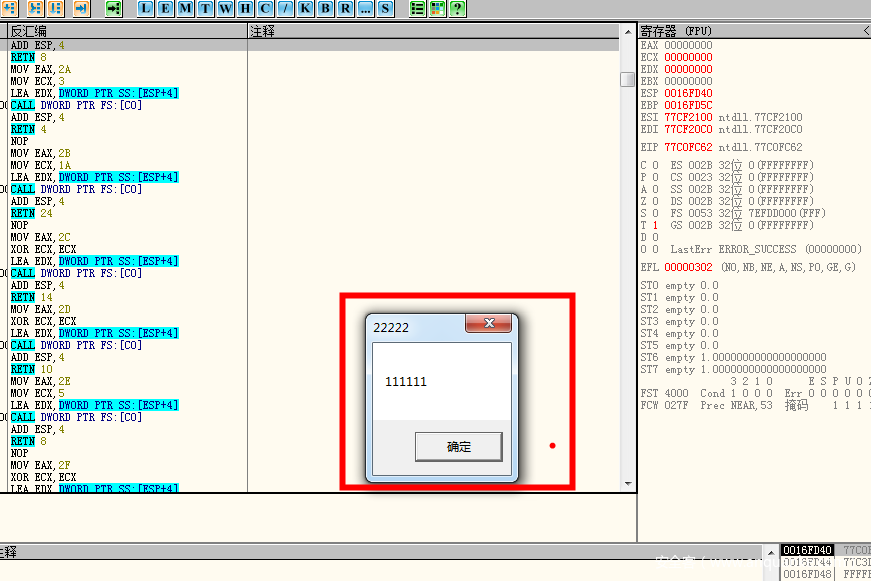 参数基本一模一样,然后直接F8 单步运行,结果出现了返回值eax == 0