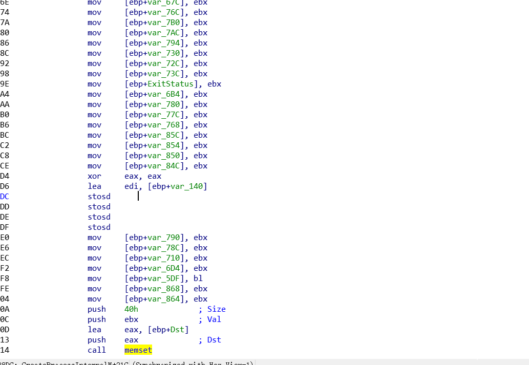 通过IDA查看CreateProcessInternalW前面基本都是一些字符串拷贝的动作