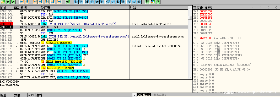 函数的eax的返回值是0xC0000039,也就是说这里调用内核去创建的时候是直接失败的,