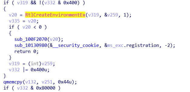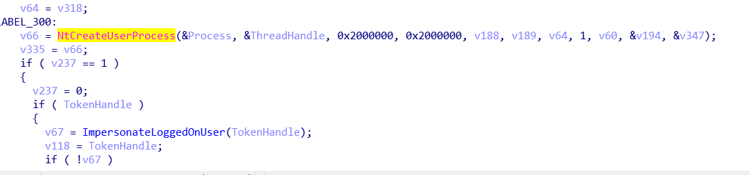 发现NtCreateUserProcess(&Process, &ThreadHandle, 0x2000000, 0x2000000, v188, v189, v64, 1, v60, &v194, &v347);