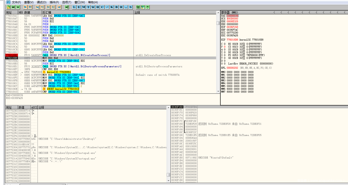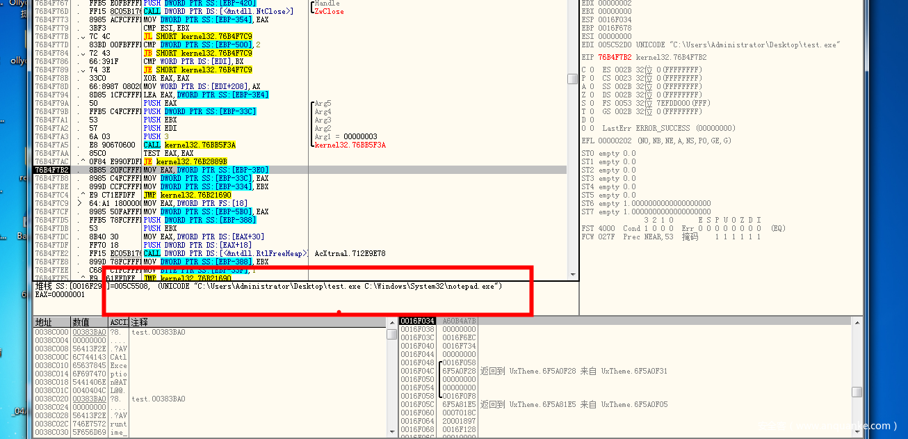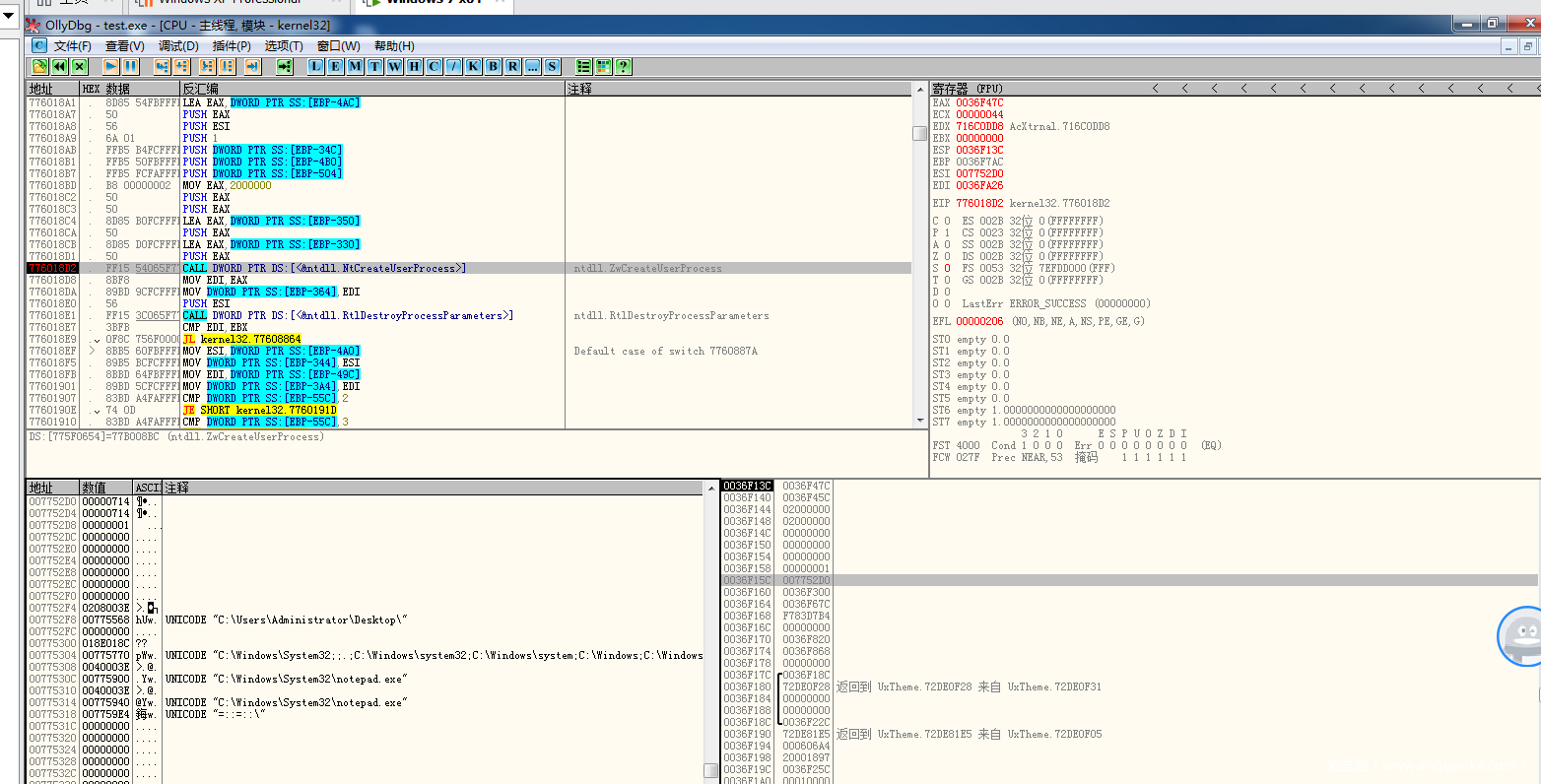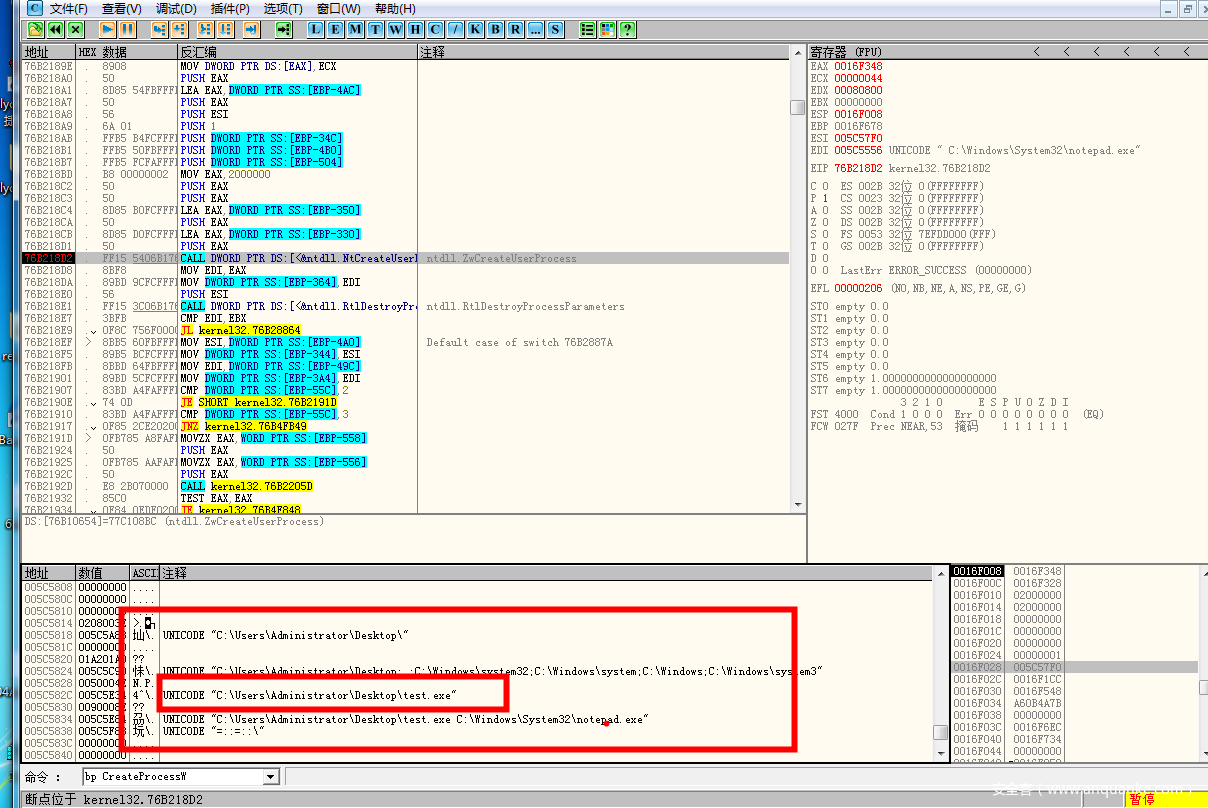 在上图可以看到两个路径被加到一起。构造的的新参数就是UNICODE "C:\Users\Administrator\Desktop\test.exe C:\Windows\System32\notepad.exe"