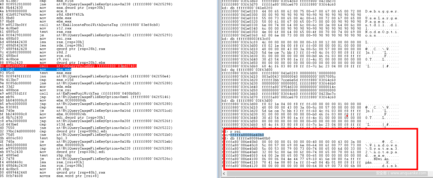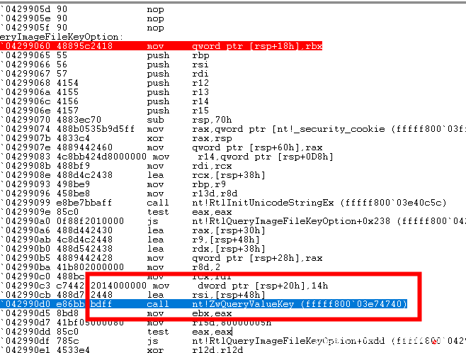 进入 RtlQueryImageFileKeyOption函数单步执行到ZwQueryValueKey时,F10后