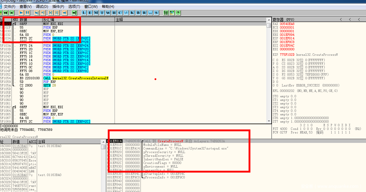 最后goto LABEL_87重新组建进程参数环境去执行新的进程,又会进入NtCreateUserProcess,但这时启动的是test.exe