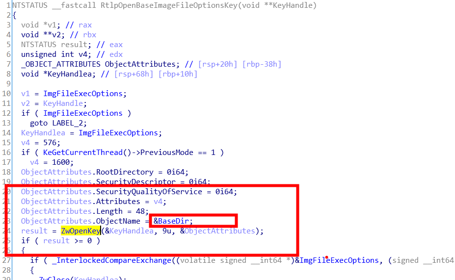 RtlpOpenImageFileOptionsKey调用了RtlpOpenBaseImageFileOptionsKey,RtlpOpenBaseImageFileOptionsKey会ZwOpenKey IFEO注册表