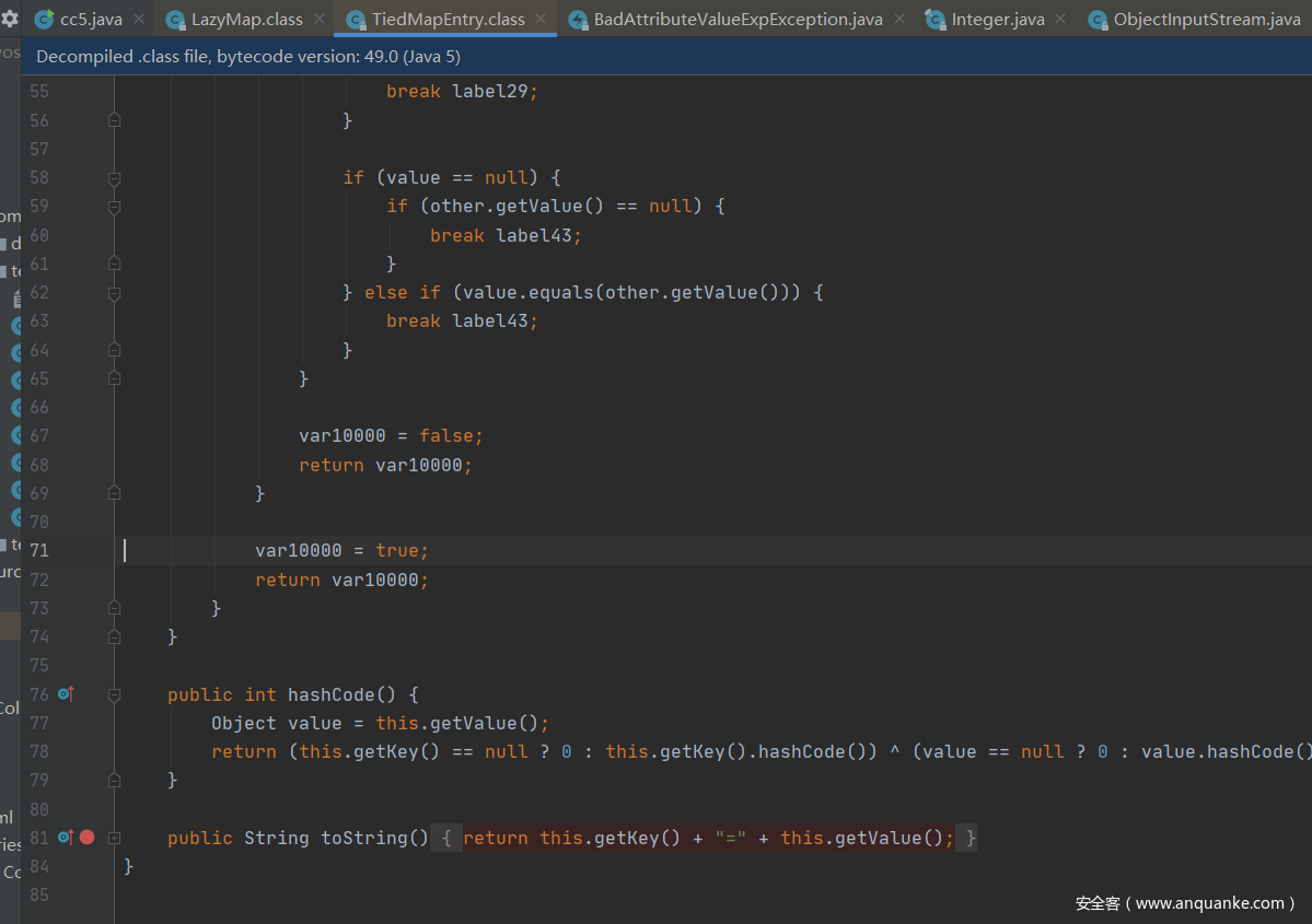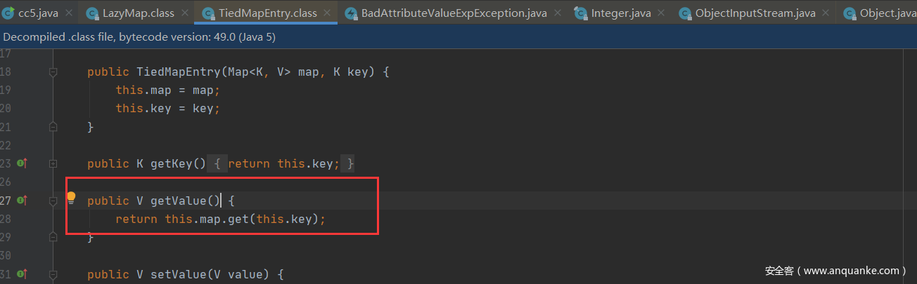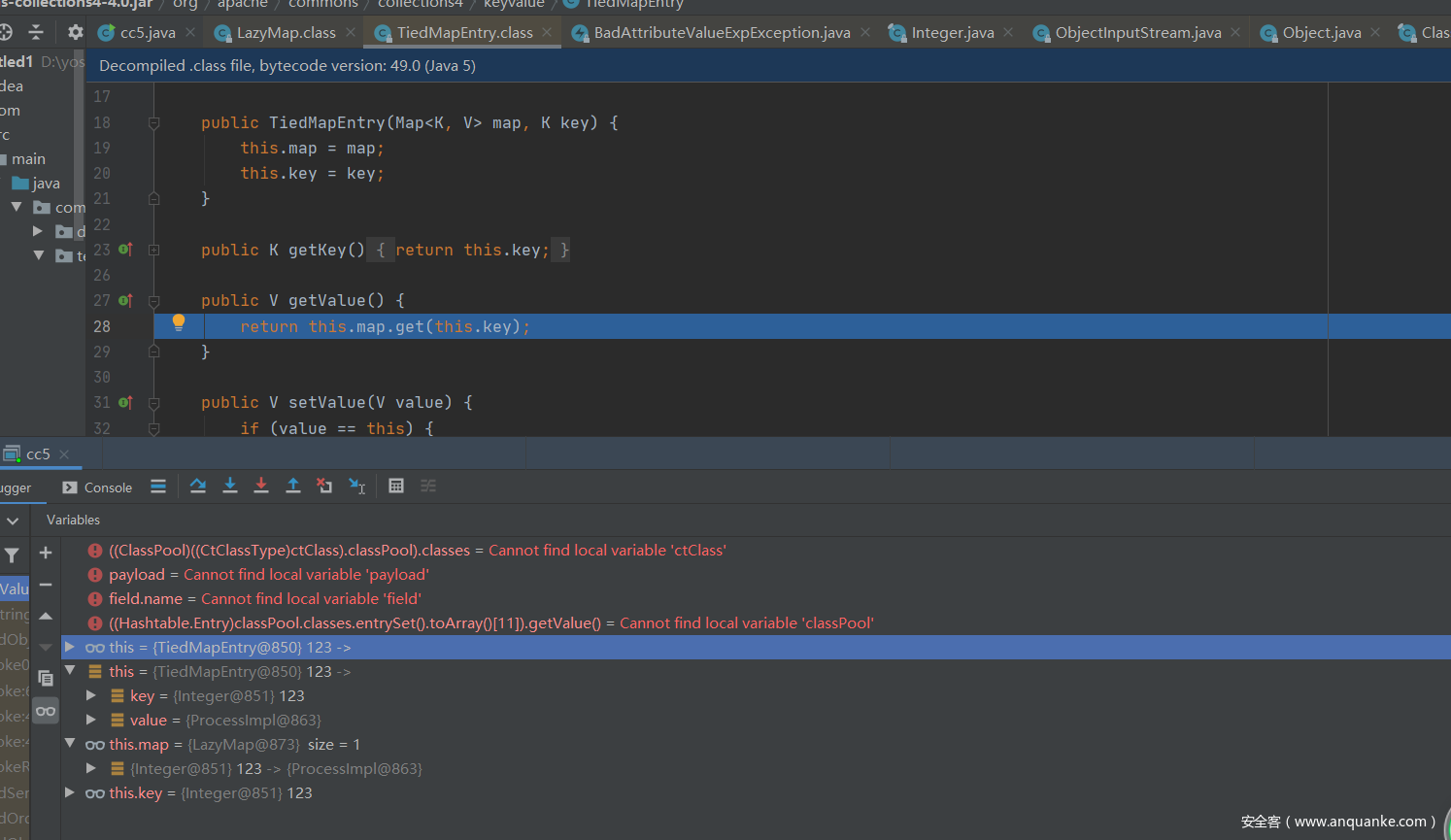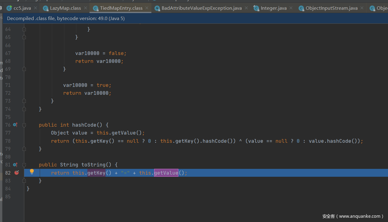 上面断点的地方会去获取val的值,赋值给valObj,前面我们使用反射将val设置为TiedMapEntry的对象。