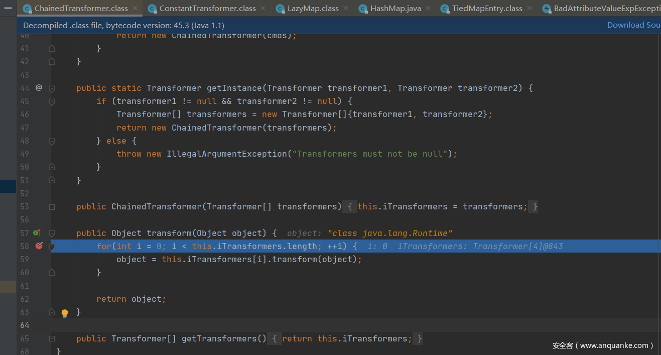 接着就是遍历调用数组里面的transform方法。第一个值为ConstantTransformer,会直接返回传参的值。
